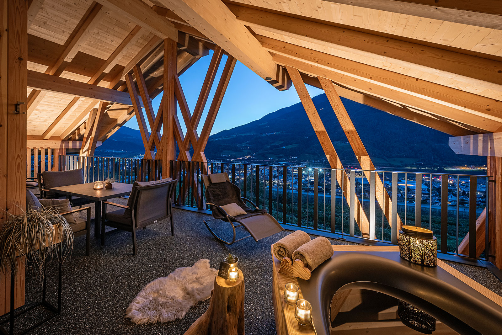 Erleben Sie romantische Momente in der Outdoor-Badewanne oder auf den Lounge-Liegen der Loggia mit absoluter Privatsphäre. Die eigene Sauna mit Blick auf die Weinberge macht das Entspannungserlebnis perfekt.