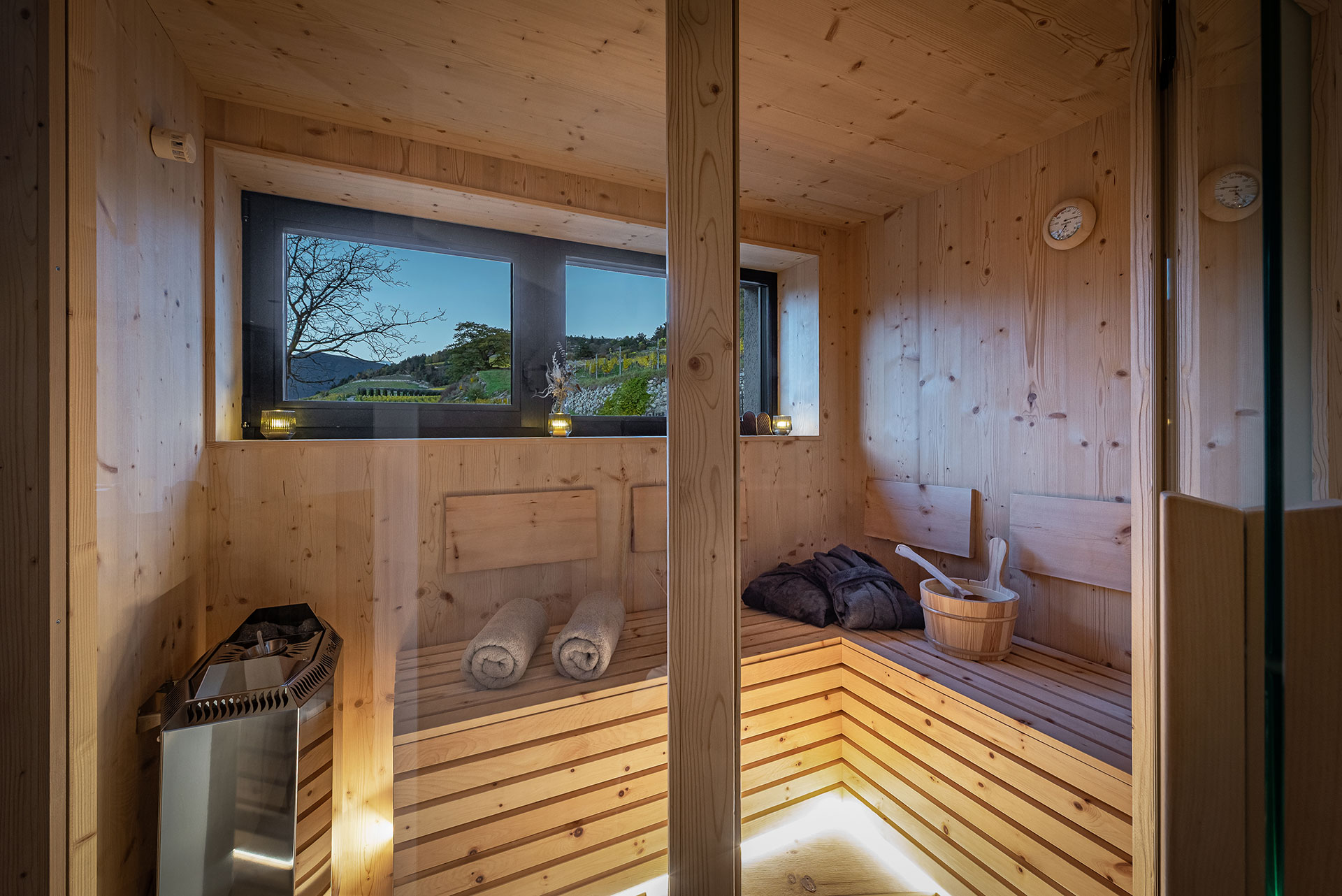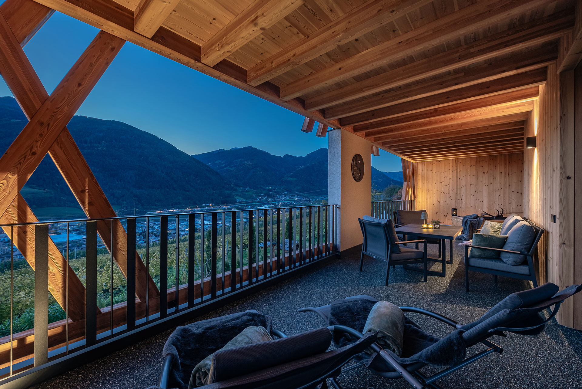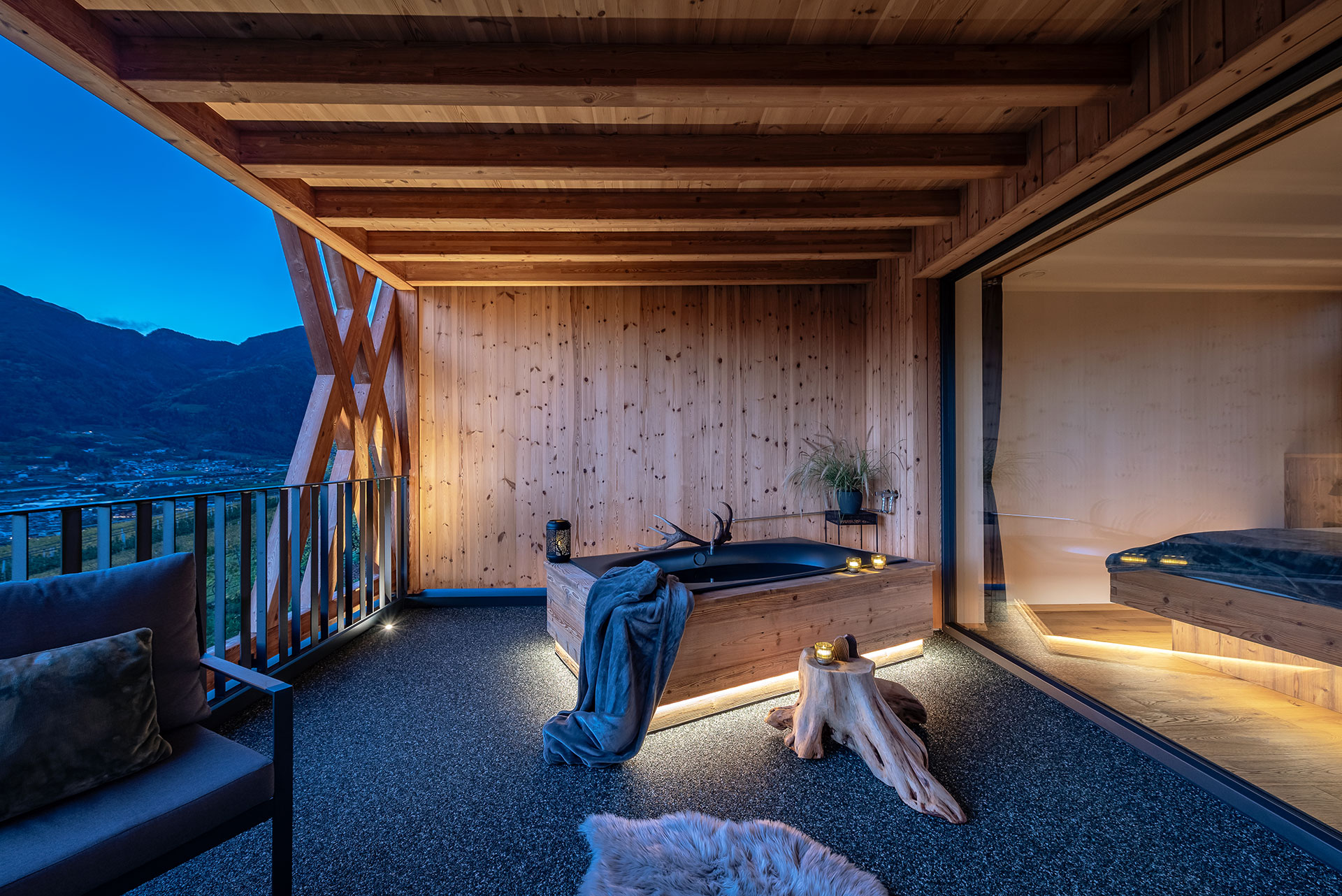 Experience exclusive living comfort at the Vineyard Chalet Steindlgut, nestled in the peaceful vineyards above the city of Brixen. Our luxurious holiday apartments combine natural materials, such as solid and reclaimed wood, with a modern design and offer an ambience that radiates style and warmth. Pure relaxation awaits you in your private sauna with a view of the vineyards – an incredibly special feel-good feature. On the spacious loggia you will find an outdoor bathtub and comfortable sun loungers – the perfect place for romantic moments with a view of the city and the surrounding mountains. With premium details and plenty of privacy, the apartments create a luxurious retreat for connoisseurs and nature lovers.